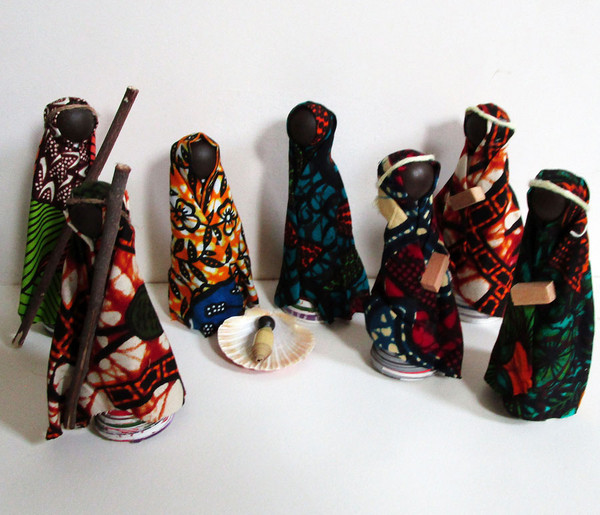 The manger scenes in the image gallery range from an Australian Aboriginal ochre painting on eucalyptus tree bark to a minimalist colored wood block Nativity set from British Homeware Designer Sebastian Bergne. There are painted wooden Christmas figurines by Indian toy-makers from Varanasi, the holiest of Hindu pilgrimage sites; five-layered nesting dolls from Russia; an abstract earthenware Nativity set from the American Southwest; and a beautifully-grained beech “wood book” from Bavaria. A Buddhist deva stands in for a guardian angel in a Thai Celadon ceramic Nativity set and a short-horned West African Brahman cow replaces the ox by the crib in a blackened earthenware manger set from Cameroon. Two other "eco-friendly" sets from Africa are made from waste banana plant fiber and recycled soda cans.